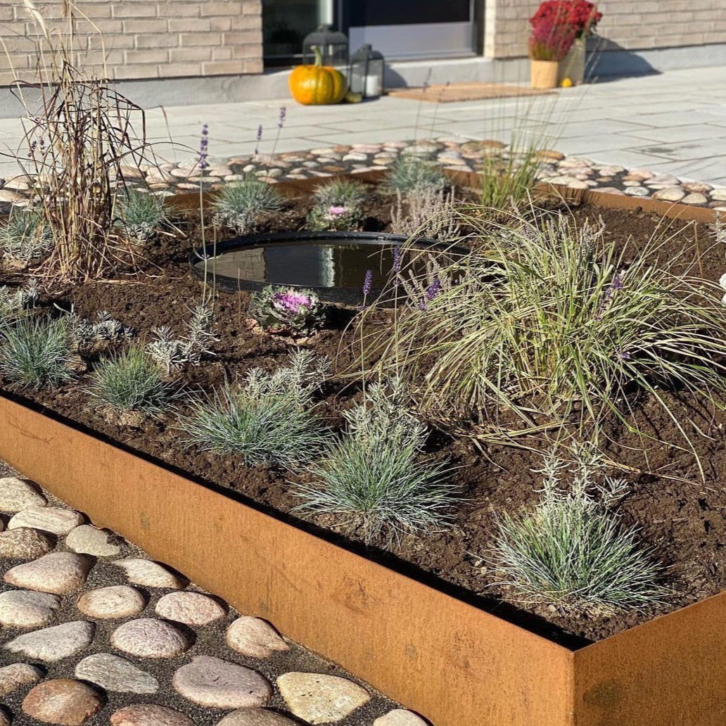 Bedkanter kan bøyes til myke, organiske former, men er også stive nok til å skape lange, rette seksjoner i hagen. 2 mm er lettere å bøye enn 3 mm. Bedkanter kan ikke brettes, bare bøyes. For mer organiske former anbefaler vi 2 mm cortenstål.
