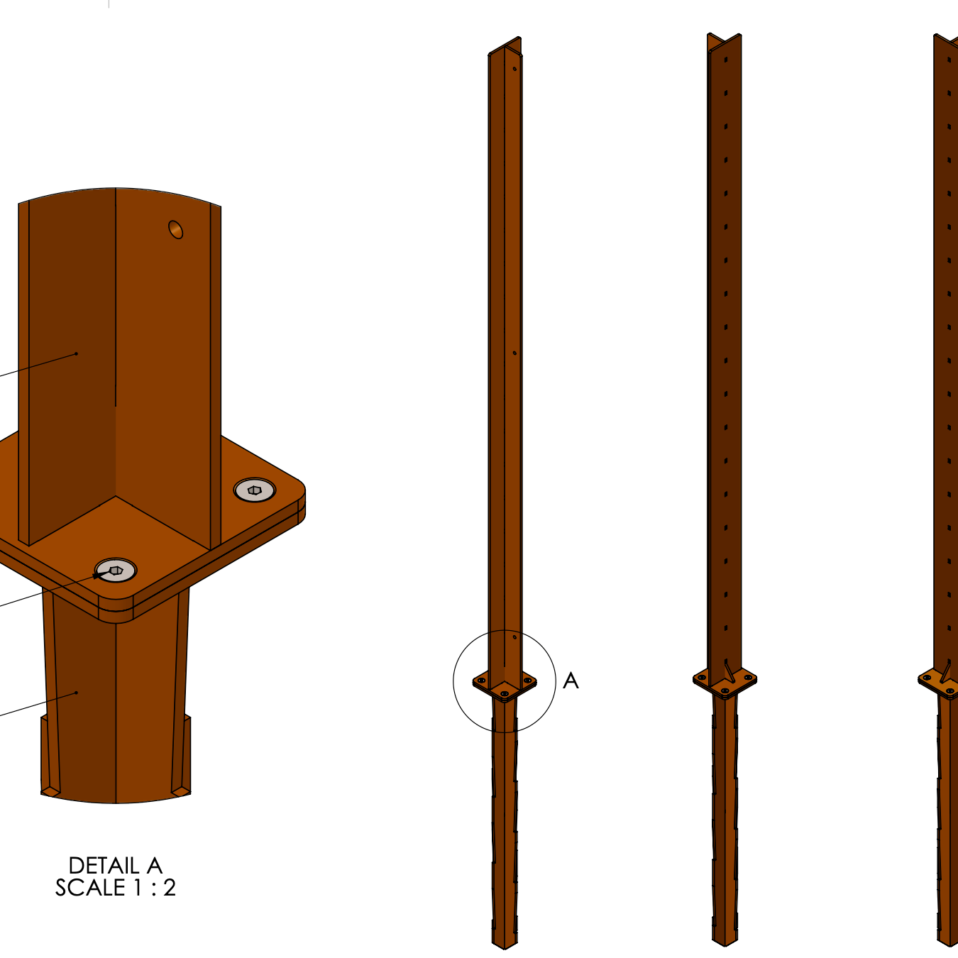 Stolpe til gjerde i lakkert stål. Passer til våre gjerder. Laget av 6 mm cortenstål med jordspyd. Stolpen har en total høyde på 2700 mm, hvorav 1900 mm er over jorden. Stolpen har en bredde på 106 mm.