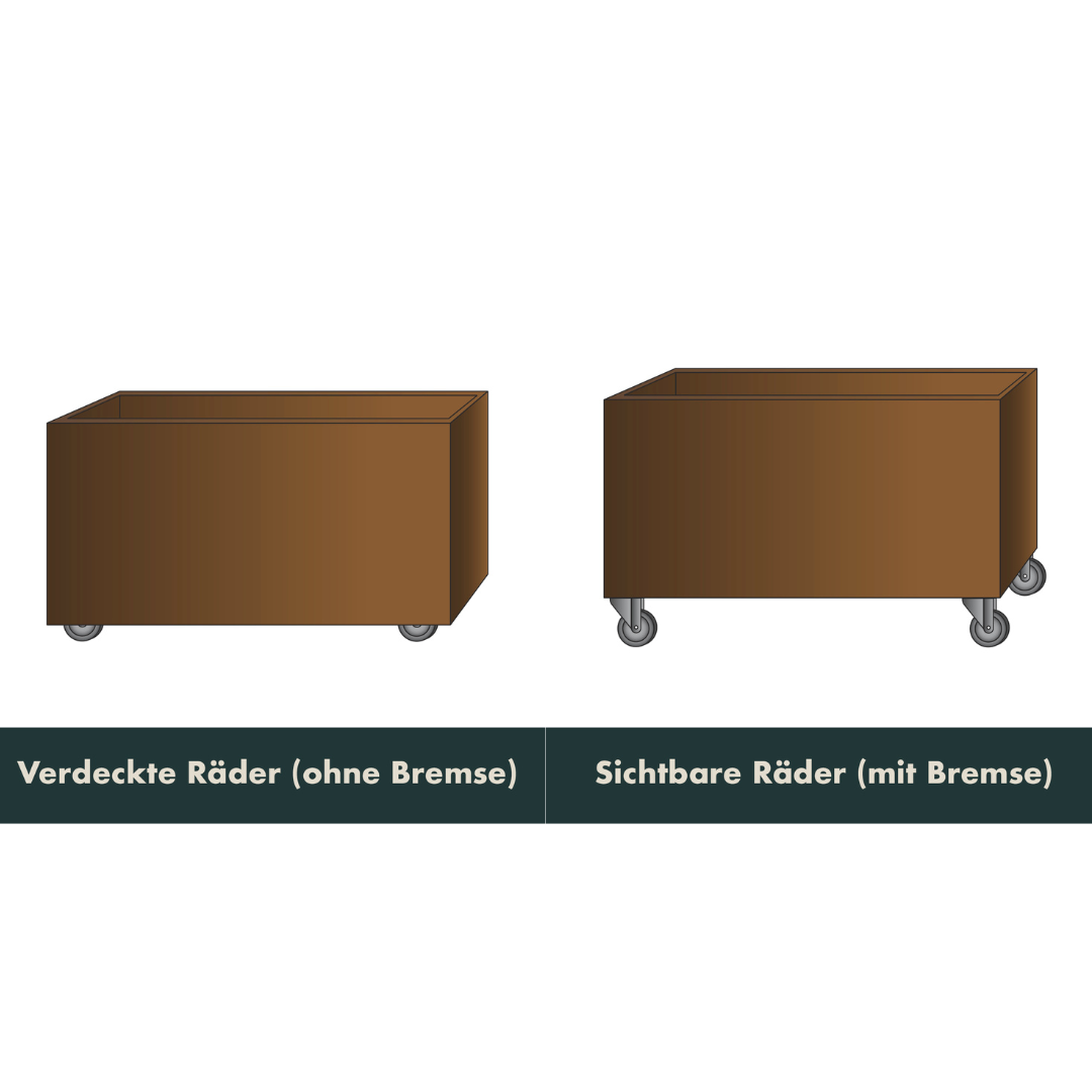 En plantekasse i cortenstål med hjul gjør det mulig å plassere høybede på ønsket sted – på terrassen, i hagen eller hvor du måtte ønske. Bestill plantekassen i ønskede dimensjoner. Vi legger til det nødvendige antall hjul – minst 4.