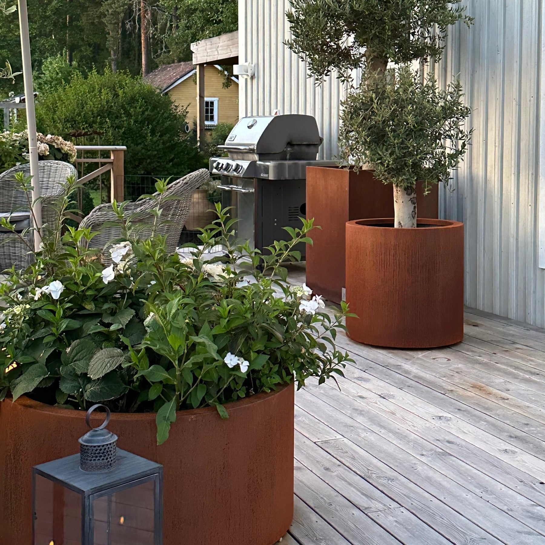 Rund plantekasse laget av 3 mm cortenstål. Håndlaget på vår fabrikk i Danmark etter de nøyaktige målene som passer til ditt uterom.